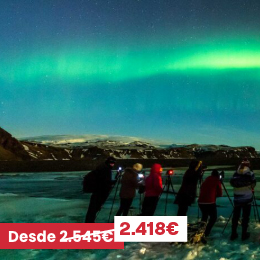 Ideal para: Quienes quieren un equilibrio entre aventura y relajación. Este tour combina lo mejor de Islandia: paisajes invernales, aguas termales y, por supuesto, la búsqueda de auroras boreales. Con cinco días para explorar a fondo, tendrás tiempo de sobra para disfrutar cada momento. Con nuestra promoción, esta experiencia única es mas accesible que nunca. ¡Date el capricho que te mereces! Ver el Tour Auroras Boreales Express >>